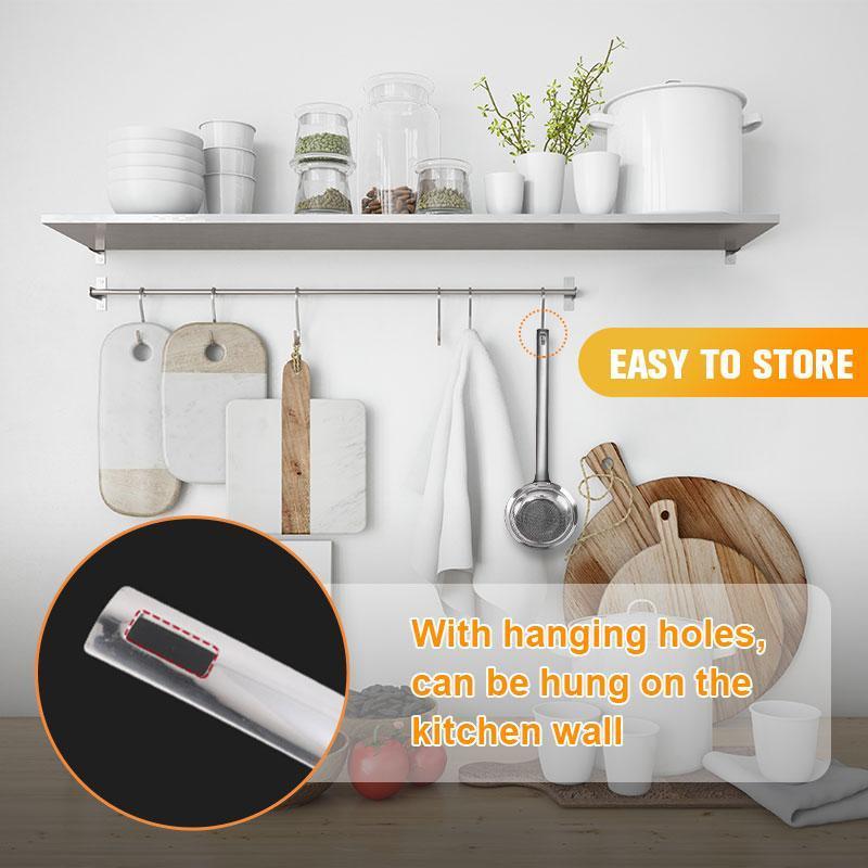 - Das Ende des Griffs ist mit einem Aufhängeloch versehen, das an der Küchenwand aufgehängt werden kann, was leicht zu organisieren ist und keinen zusätzlichen Platz beansprucht.