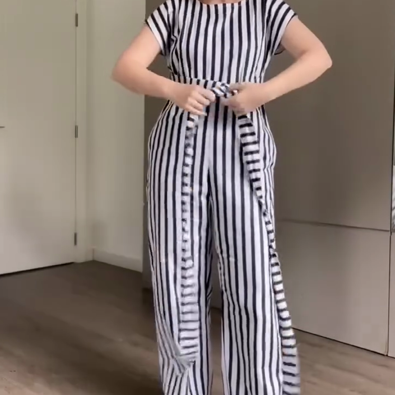 Lieferumfang: 1 × Damen-Kurzarm-Jumpsuit mit Streifenmuster, Schnürung und weitem Bein
